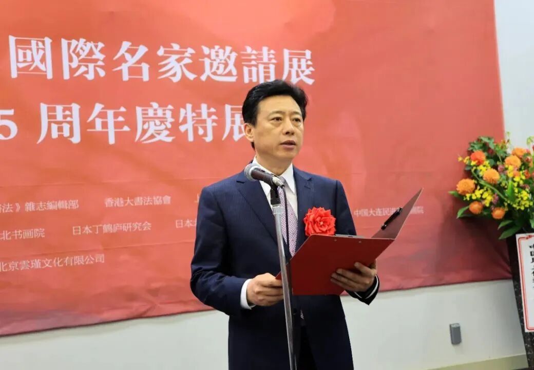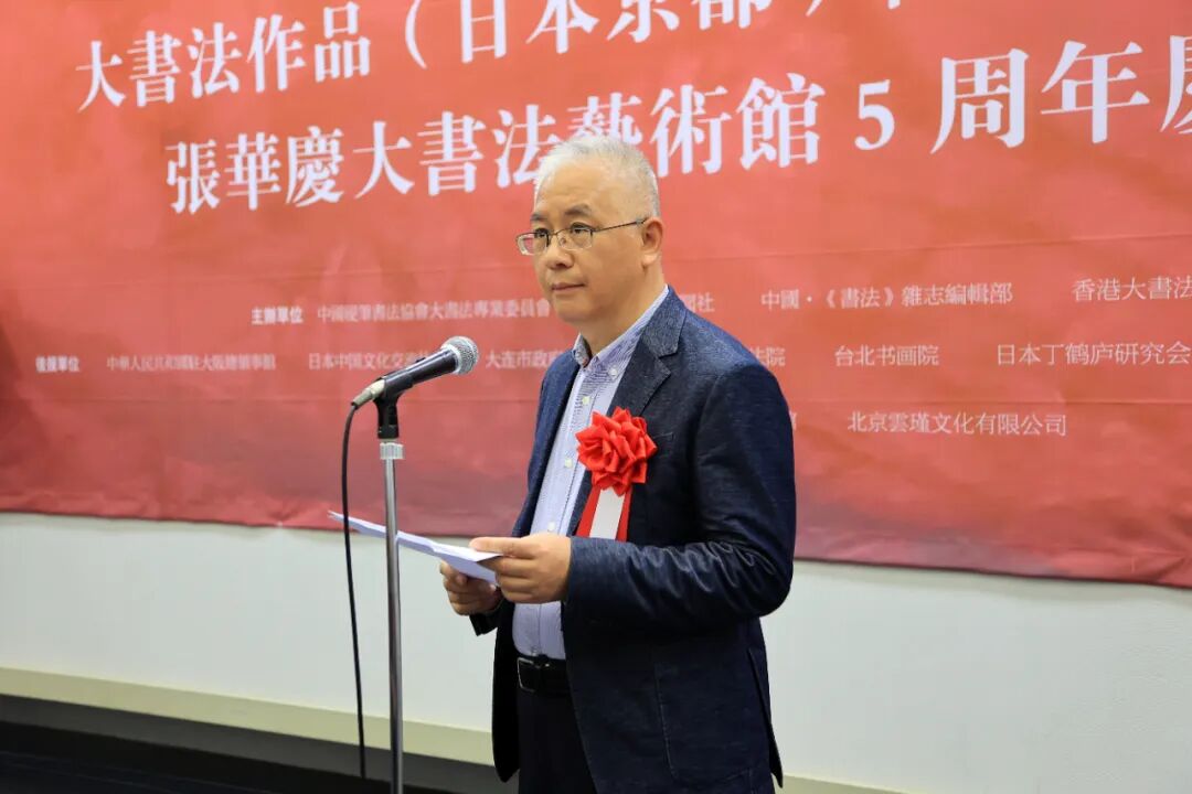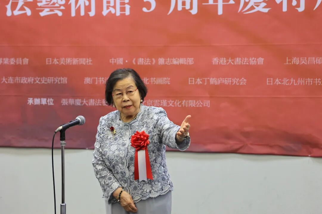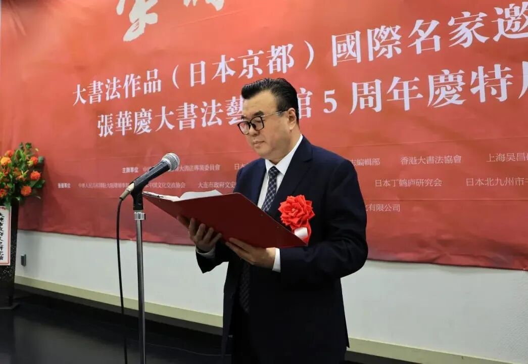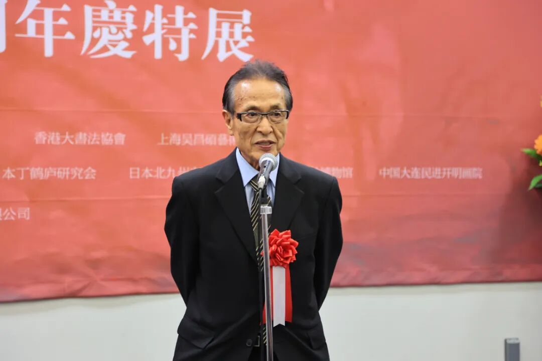 张华庆、聂瑞麟、李冰、王立翔、中野晓、师村妙石、许由、加藤千洋、张炳煌、萱原晋、丁如霞、罗建辉、尾崎苍石、井谷五云、山下方亭、陈嘉子、陈美秀、冯万如、李伟宏、欧耀南、孙学丽、黄玉琴、熊洁英、梁秀等嘉宾为展览剪彩揭幕。本次展览由中国硬笔书法协会大书法专业委员会、日本美术新闻社、《书法》杂志编辑部、香港大书法协会、上海吴昌硕艺术研究协会共同主办,中国驻大阪总领事馆、日本中国文化交流协会、大连市政府文史研究馆、澳门书法院、台北书画院、日本丁鹤庐研究会、日本北九州市书道协会、韩国碑林博物馆、大连民进开明画院为后援单位。