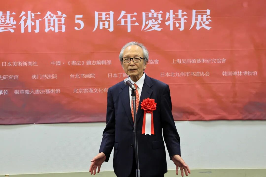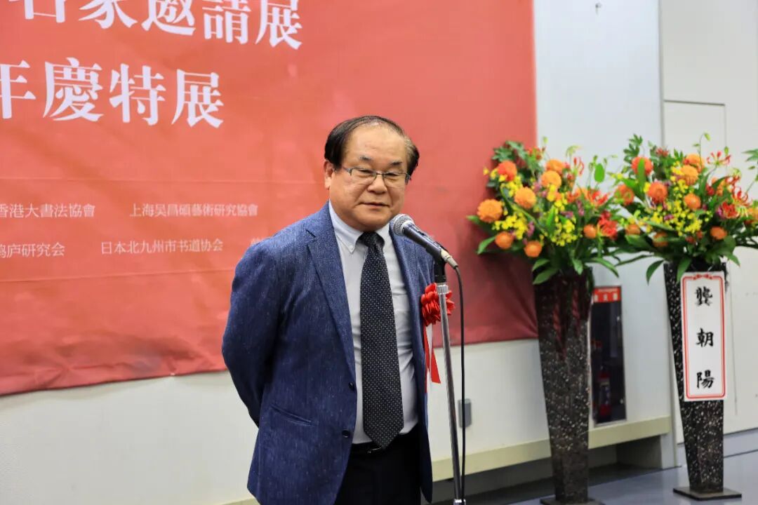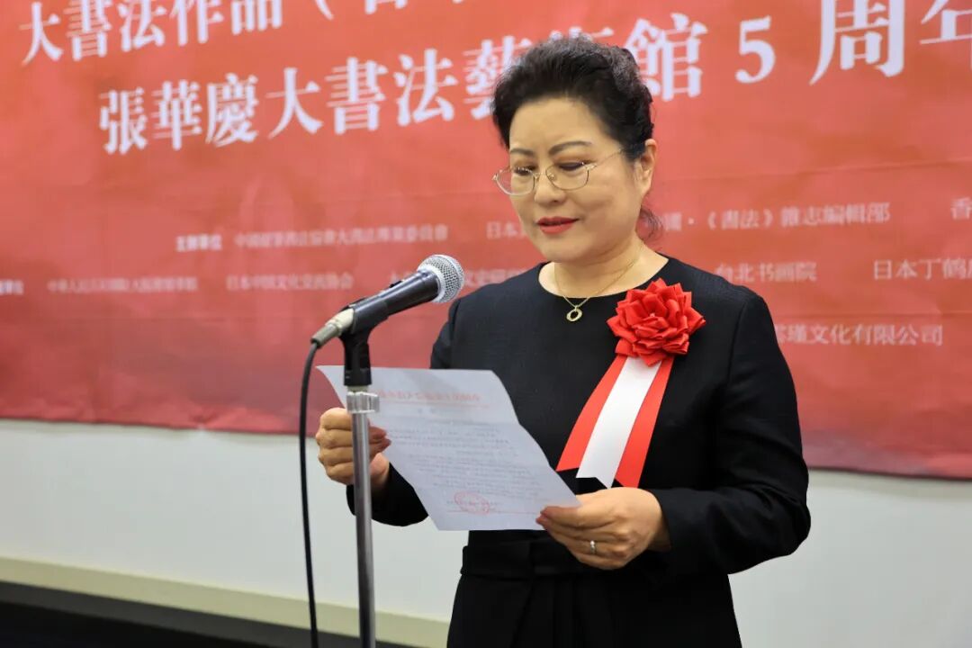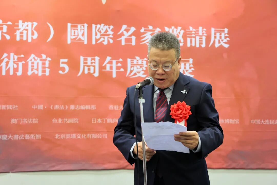 张华庆、聂瑞麟、李冰、王立翔、中野晓、师村妙石、许由、加藤千洋、张炳煌、萱原晋、丁如霞、罗建辉、尾崎苍石、井谷五云、山下方亭、陈嘉子、陈美秀、冯万如、李伟宏、欧耀南、孙学丽、黄玉琴、熊洁英、梁秀等嘉宾为展览剪彩揭幕。本次展览由中国硬笔书法协会大书法专业委员会、日本美术新闻社、《书法》杂志编辑部、香港大书法协会、上海吴昌硕艺术研究协会共同主办,中国驻大阪总领事馆、日本中国文化交流协会、大连市政府文史研究馆、澳门书法院、台北书画院、日本丁鹤庐研究会、日本北九州市书道协会、韩国碑林博物馆、大连民进开明画院为后援单位。