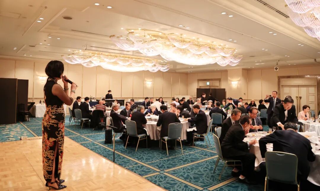 张华庆、李冰与日本著名书法篆刻家师村妙石,师村华香在招待晚会上亲切合影